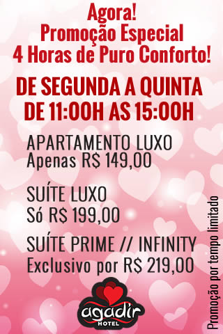 O Agadir Hotel conta com oitenta e quatro apartamentos, todos muito aconchegantes, sendo vinte e três com garagem privativa. São onze suítes compostas por sauna, hidro-massagem, frigobar, TV e muito conforto.